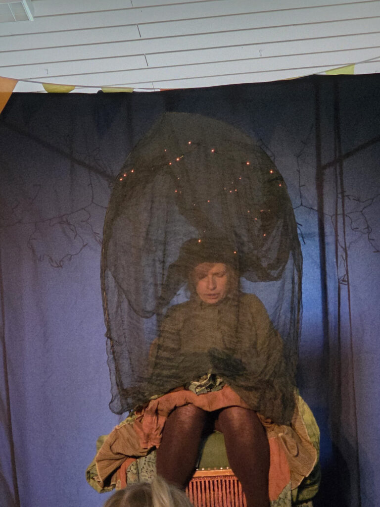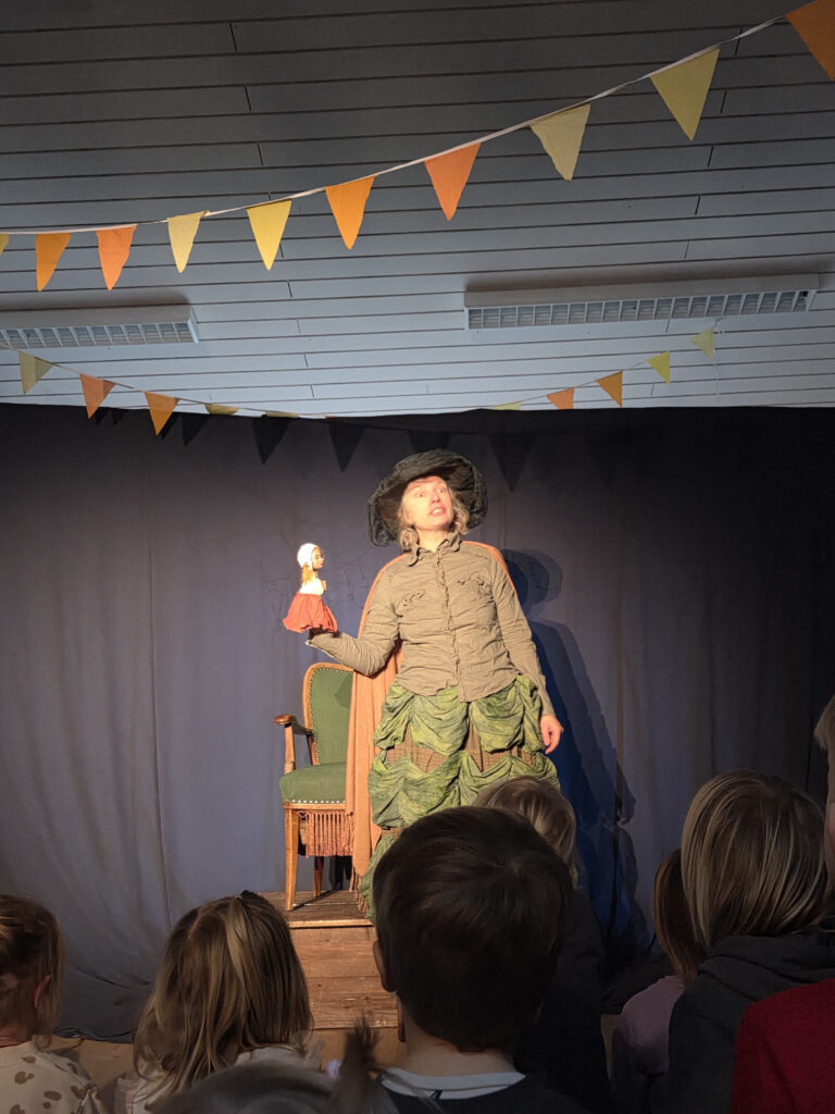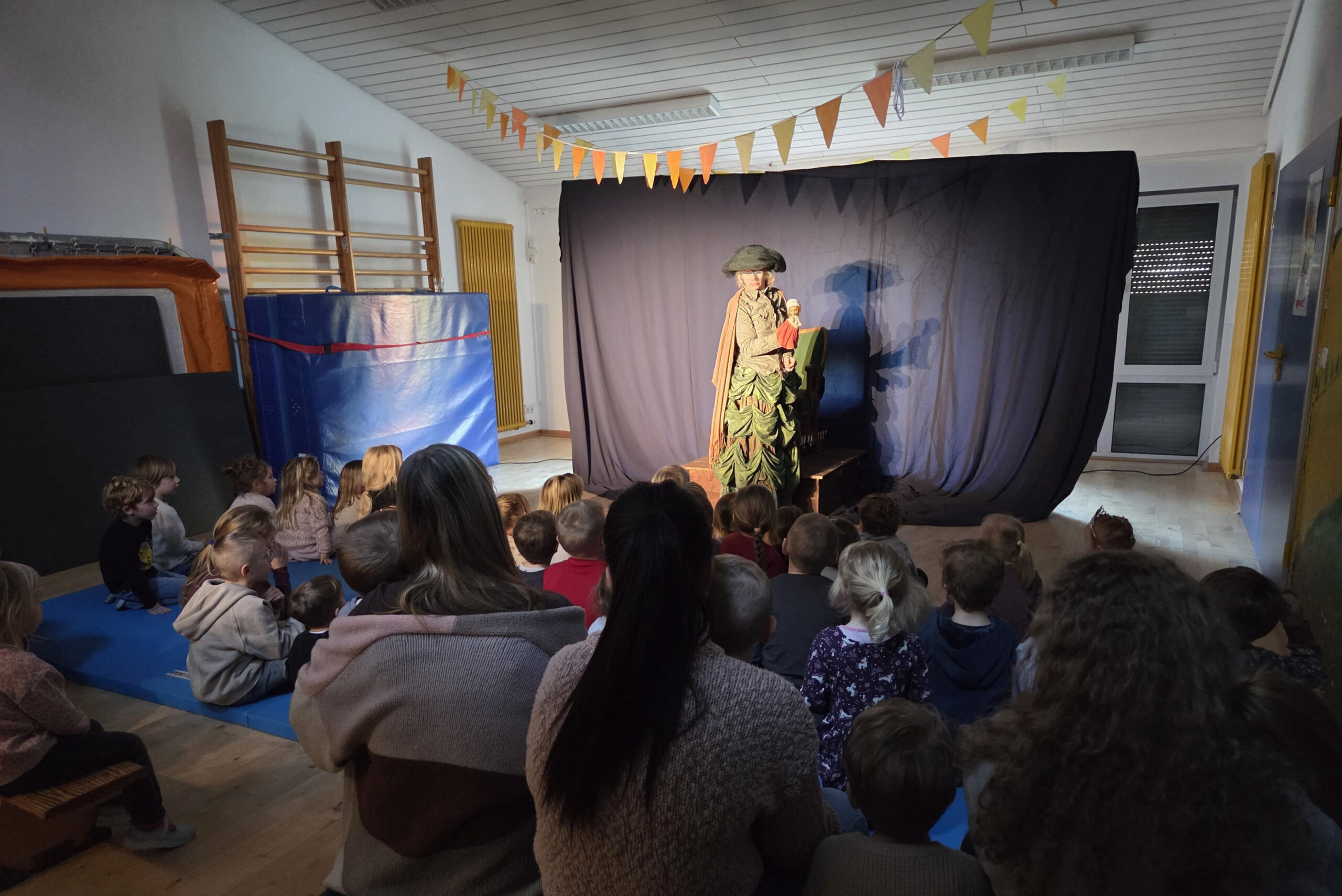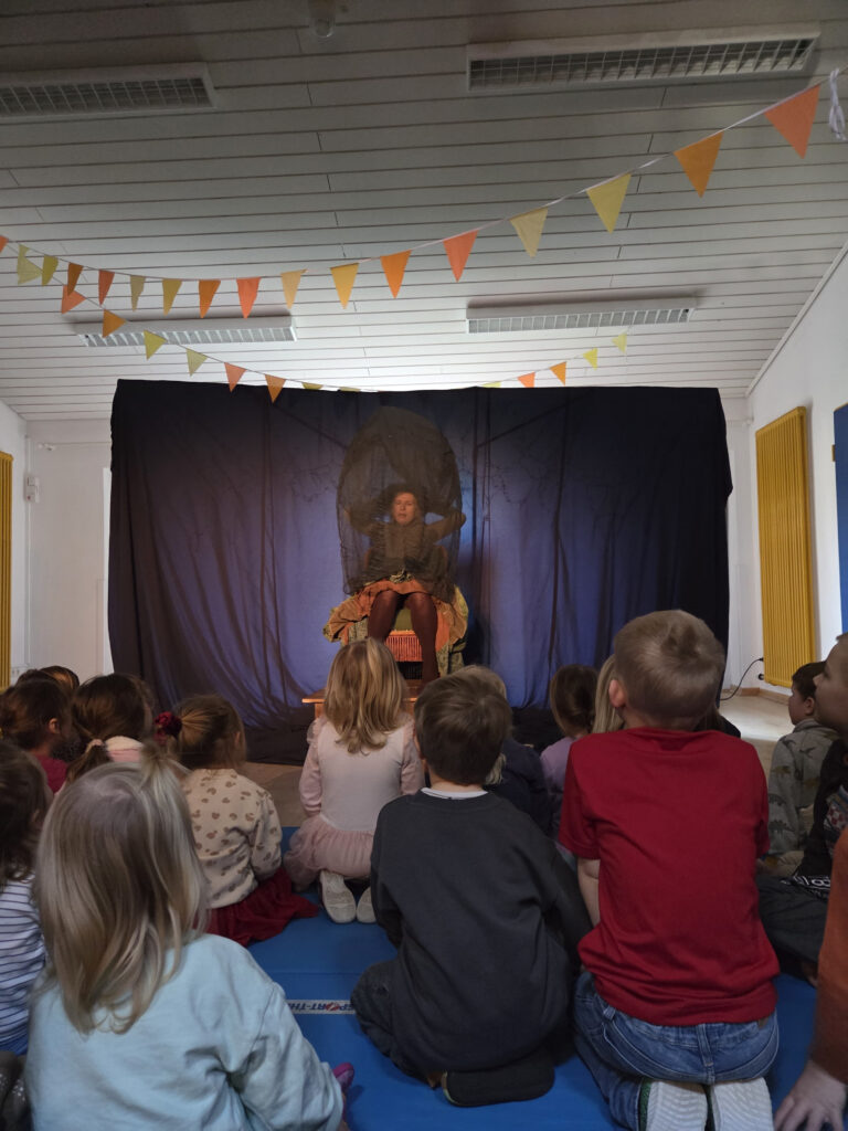 Letzte Woche war ein ganz besonderer Vormittag für alle kleinen und großen Spatzen- Stella Jabben vom Theater Blaues Haus hat uns besucht und unsere Kindergartenturnhalle in eine zauberhafte Märchenwelt verwandelt. Gespielt aus den Taschen eines großen Rockes, in dem sich Wiesen, Wälder und Seen verbergen und natürlich die geheimnisvollen und schrägen Figuren, denen Sterntaler auf ihrem Weg begegnet.